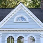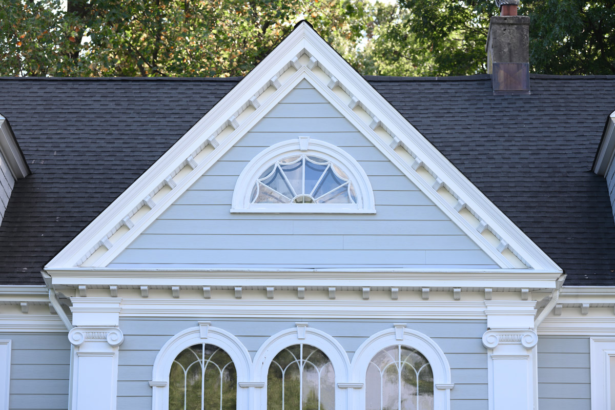 The owners of this lovely home called us one day and explained they had just had the inside of the house re-done from top to bottom, and had been instructed to get the outside fixed as to not damage their newly re-done home. This was a really interesting project for us as the trim needs were quite a lot more detailed than typical. We solved that by executing a sort of hybrid restoration/renovation. Anything that could be replaced with new materials that looked virtually the same as the old, we replaced (siding, straight runs of trim). The more intricate details, such as gorgeous capitals, dentil trim, curved windows with curved trim, etc. was left in place and painted. Going forward, the house will still need a light paint job once in a while on those intricate trim pieces, but the vast majority of the house will be maintenance free for years to come
